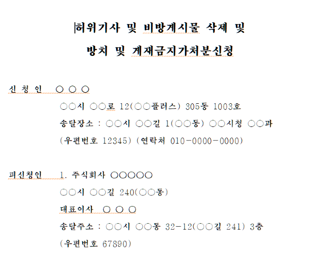 허위기사 및 비방게시물 삭제 및 방치 및 게재금지가처분신청
