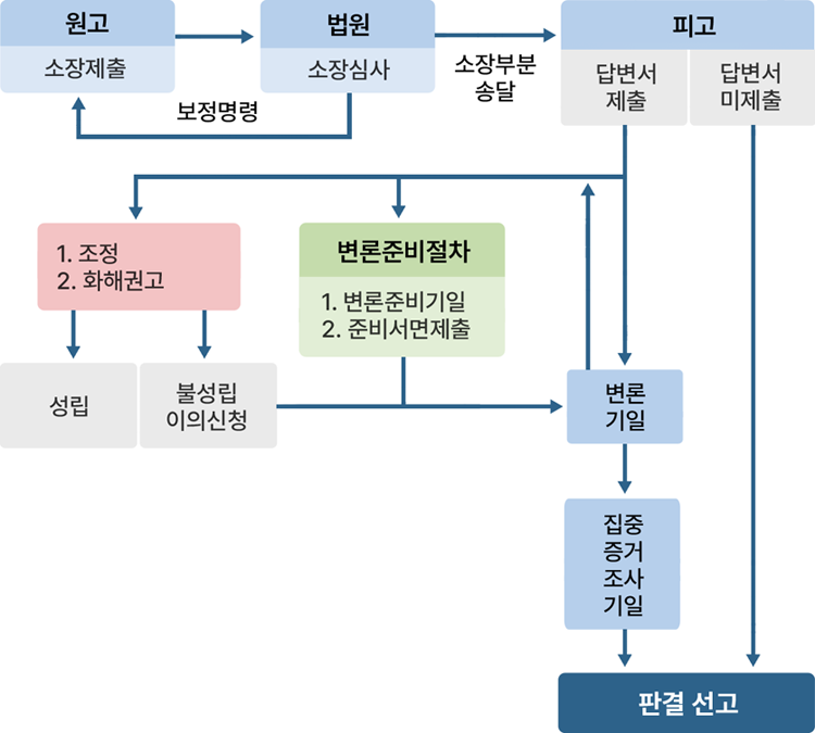 - 법원은 변론준비절차 또는 조정에 회부하여 기일을 지정하거나 화해권고에 회부하여 기일을 지정합니다.